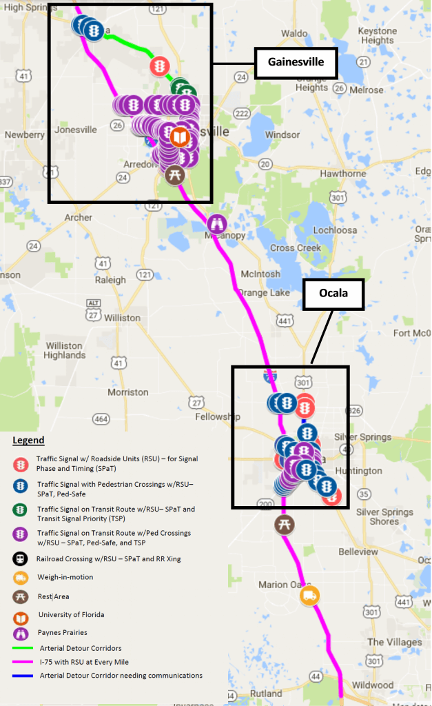 New arterial technologies will be used to improve operations, monitor traffic and infrastructure, and add data-driven signal performance measures on selected corridors. Connected vehicle on-board units (OBUs) will be used on transit buses and other vehicles to increase travel time reliability and on-time performance. Advanced safety systems will be deployed through vehicle-to-infrastructure (V2I) communications and mobile app technology. Transportation system performance data will be collected, analyzed, and disseminated. The project spans both FDOT Districts 2 and 5. A systems manager has been selected in both districts, and the current production dates are the third quarter of 2018 for District 2 and the first quarter of 2019 for District 5. Vendor meetings, data collection, and survey are underway to allow for seamless integration of this combined effort. The planned deployment map is shown below.