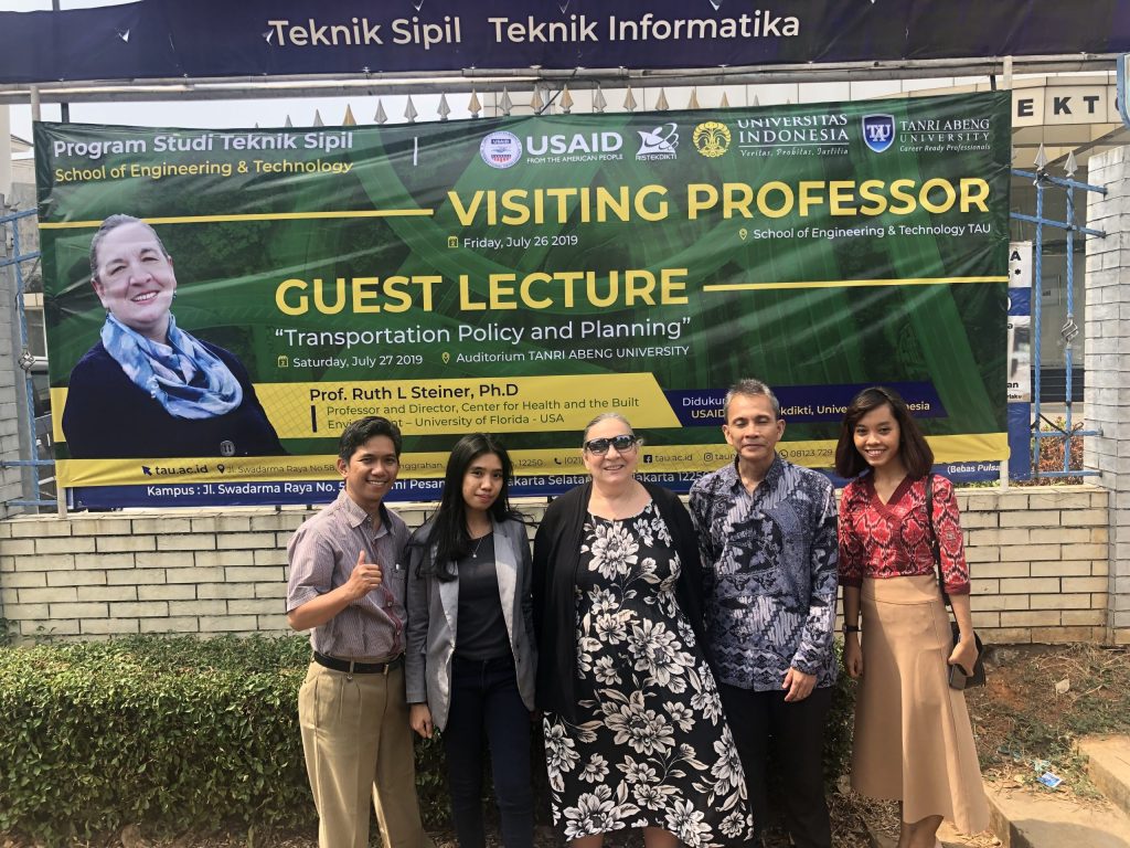 Over the summer this year, Dr. Ruth Steiner of the Department of Urban & Regional Planning, participated in an ongoing collaboration between the University of Florida and the University of Indonesia on an International Development Smart Cities project. Dr. Steiner was a keynote speaker at a the International Conference in Quality on Research in Padang, Indonesia. During her trip, Dr. Steiner met with transportation engineering faculty and also made public presentations at Ganadarma University and Tanri Abeng University.