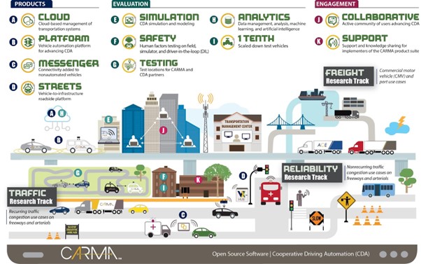 CARMA is a program that advances research and the development of cooperative driving automation (CDA) with the objective of accelerating market readiness and deployment. CARMA uses a multimodal approach to inspire collaborative research for potential implementation.