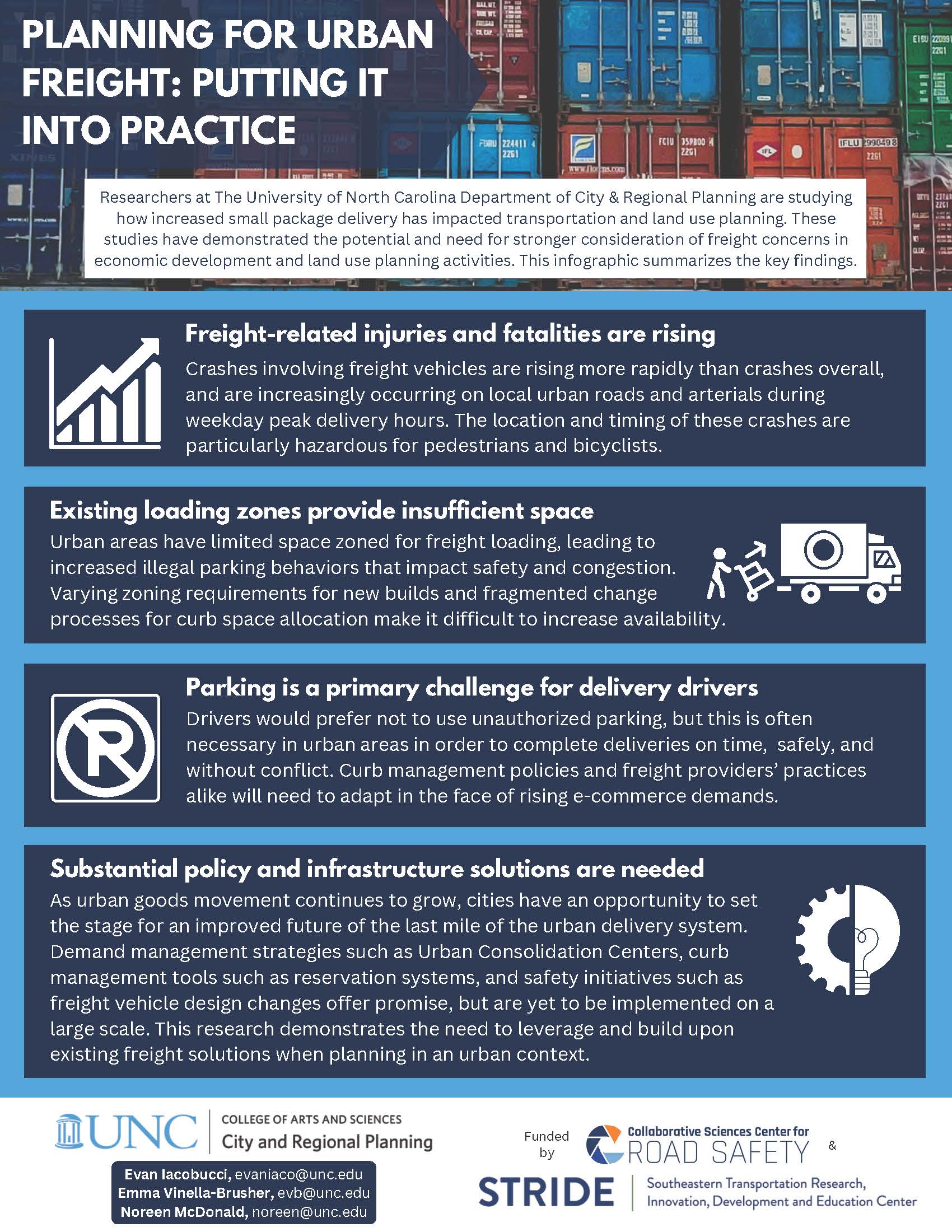 Our STRIDE partner, the University of North Carolina at Chapel Hill Chapel Hill studied the rise of urban freight delivery vehicle crashes, injuries and fatalities. The research team produced an infographic to summarize their key findings and possible solutions.