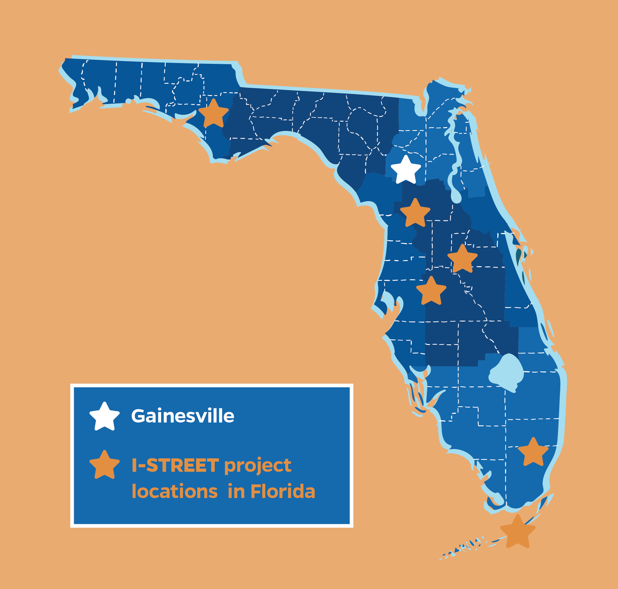 I-STREET is unique because it’s a “living lab” environment with open-road testing, built in collaboration with the Florida Department of Transportation and the City of Gainesville. According to I-STREET Manager, Dr. Pruthvi Manjunatha, they have tested software and equipment across Florida (see map.) In 2023, they hosted a statewide industry showcase funded by FDOT and attended by over 40 companies. They also co-hosted the Florida Plugfest with FDOT and OmniAir at SunTrax in Auburndale.